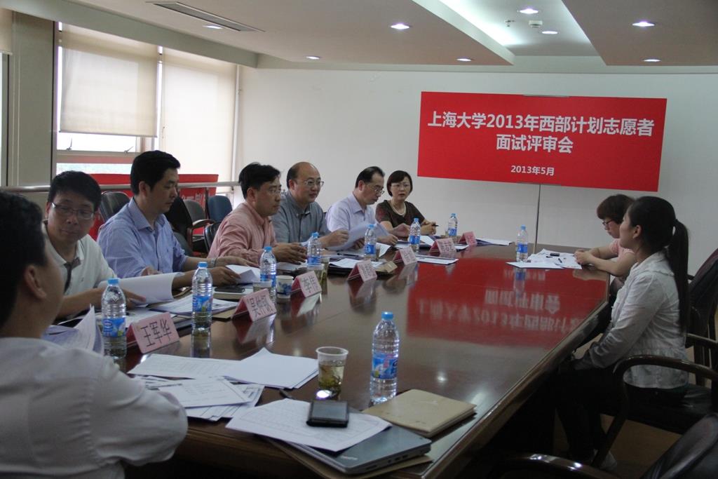 5月22日下午1点30分,beat365英国官网网站2013年西部志愿者评审会在校本部行政楼403举行。校党委副书记鲁雄刚、校长助理兼组织部部长徐旭、校长助理兼研工党委书记李伟、党委宣传部部长兼文明办主任陈志宏、纪委副书记兼监察处处长吴仲钢、招毕办常务副主任叶红、社区管理部主任王军华和校团委书记胡大伟等评委老师,对13名志愿者候选人进行了面试。