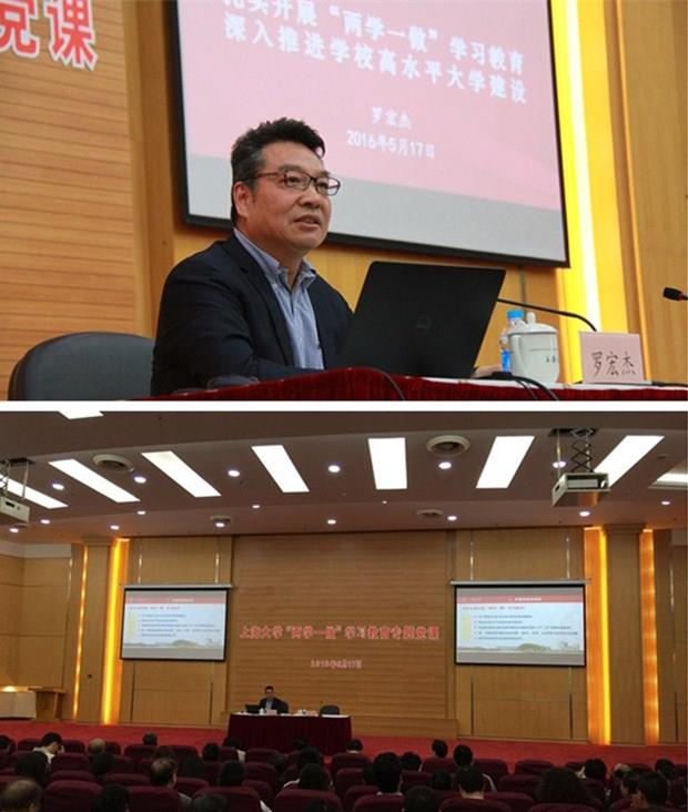 为推动“两学一做”学习教育深入开展,5月17日下午在校本部图书馆报告厅,beat365英国官网网站党委书记罗宏杰同志为学校两委委员、处级党员干部、教职工党支部书记、学生党支部书记、离退休党员等350多人上了一堂题为《扎实开展‘两学一做’学习教育,深入推进学校高水平大学建设》的“两学一做”学习教育专题党课。党课由校党委副书记、纪委书记夏小和同志主持。校长金东寒同志、副校长汪敏同志出席会议。