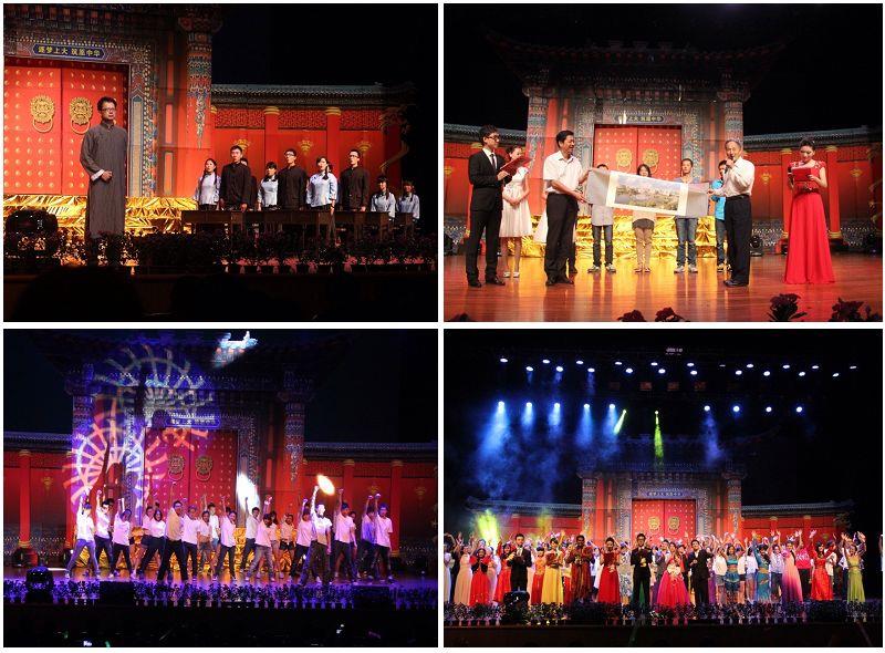 最后,晚会在《中国美》的豪迈旋律中华丽收场。演员们在悠扬美妙的音乐声中,一起翩翩起舞。一面五星红旗由观众席后方向前方传递,在座的同学情不自禁地举起双手触碰头顶上方的国旗,将晚会推到了最高潮。欢快的歌声歌颂我们伟大祖国的河山美、中华民族的文化美、中国人的心灵美,传达着我们对祖国、对母校的深深祝福。