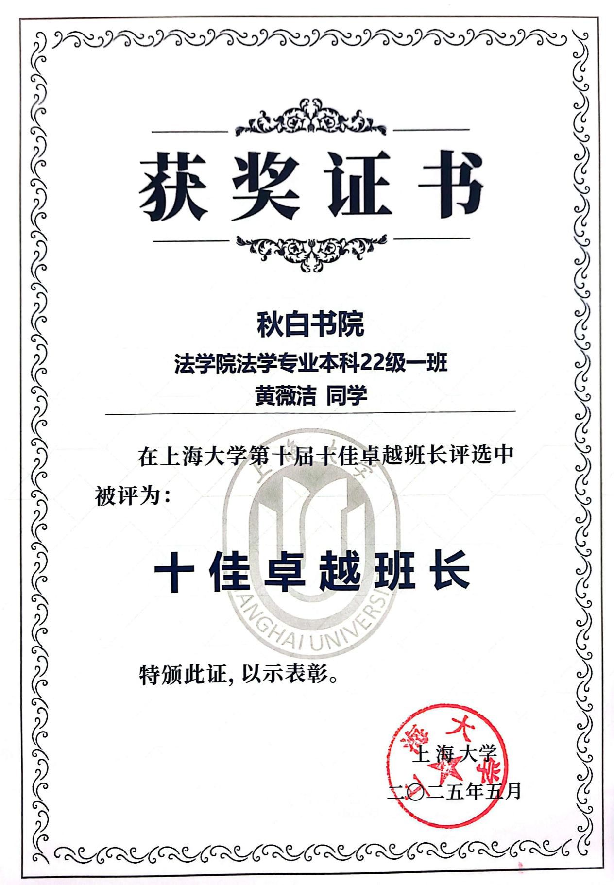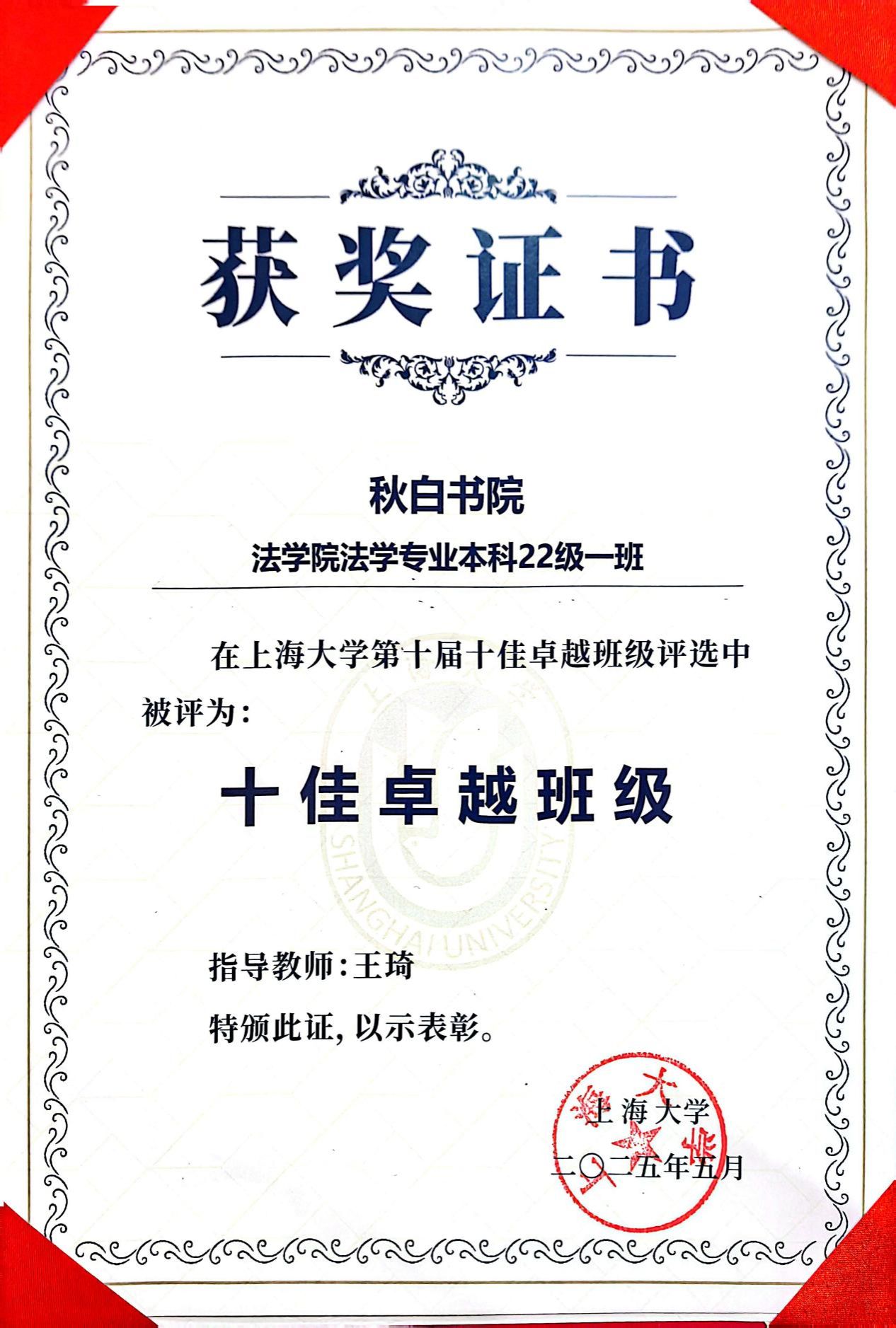 5月11日,“融汇青衿班韵 共谱书院华章”beat365英国官网网站第十届卓越班级评比大赛在beat365英国官网网站宝山校区图书馆报告厅举行,法学院法学专业本科22级一班荣获beat365英国官网网站第十届十佳卓越班级称号,法学专业本科21级一班荣获beat365英国官网网站书院荣誉班级“中夏班”称号,法学院法学专业22级一班班长黄薇洁荣获beat365英国官网网站第十届十佳卓越班长称号。