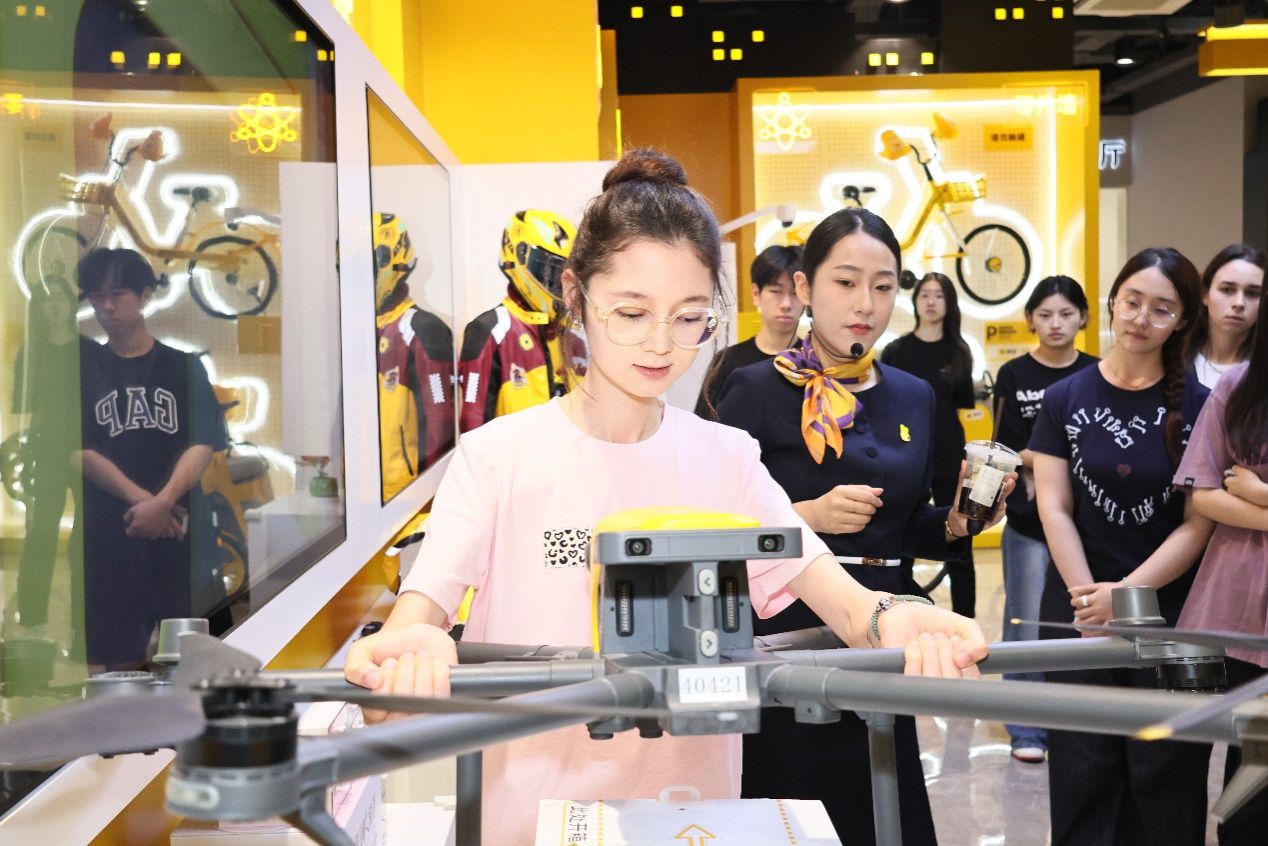 同学们还“零距离”接触了美团的创新产品,如无人车、无人机和骑手感应头盔、可降解运动鞋等。工作人员现场演示了无人机的配送流程,“有了无人机配送,爬长城时也可以点外卖了!”工作人员笑着说。同学们受邀亲手感受一台无人机的重量,“很轻!”一名女同学说。此外,智慧餐厅、智慧酒旅、共享出行、智慧药店及智能配送站等领域的创新解决方案,也充分展示了美团在衣食住行各个维度的智能布局与技术突破。