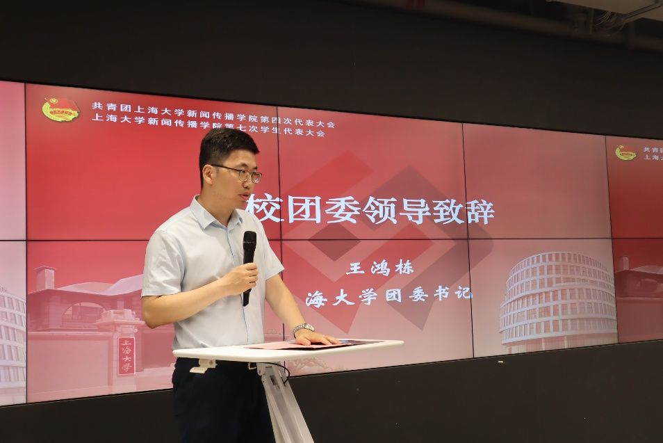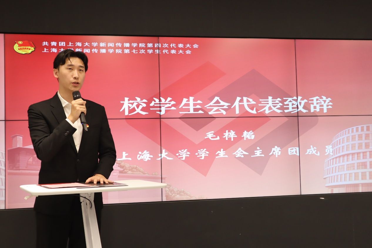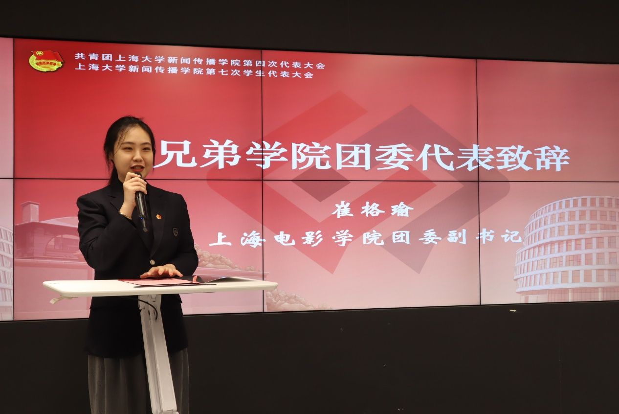 beat365英国官网网站团委书记王鸿栋,新闻传播学院党委书记王晴川,新闻传播学院党委副书记、副院长王智君,上海电影学院团委副书记崔格瑜,beat365英国官网网站学生会主席团成员毛梓韬,上海电影学院学生会主席团成员张以恒等嘉宾应邀出席大会。学院团学工作负责老师、团员代表、学生代表共百余人参加会议,共同见证这场凝聚青年力量、擘画发展蓝图的盛会。