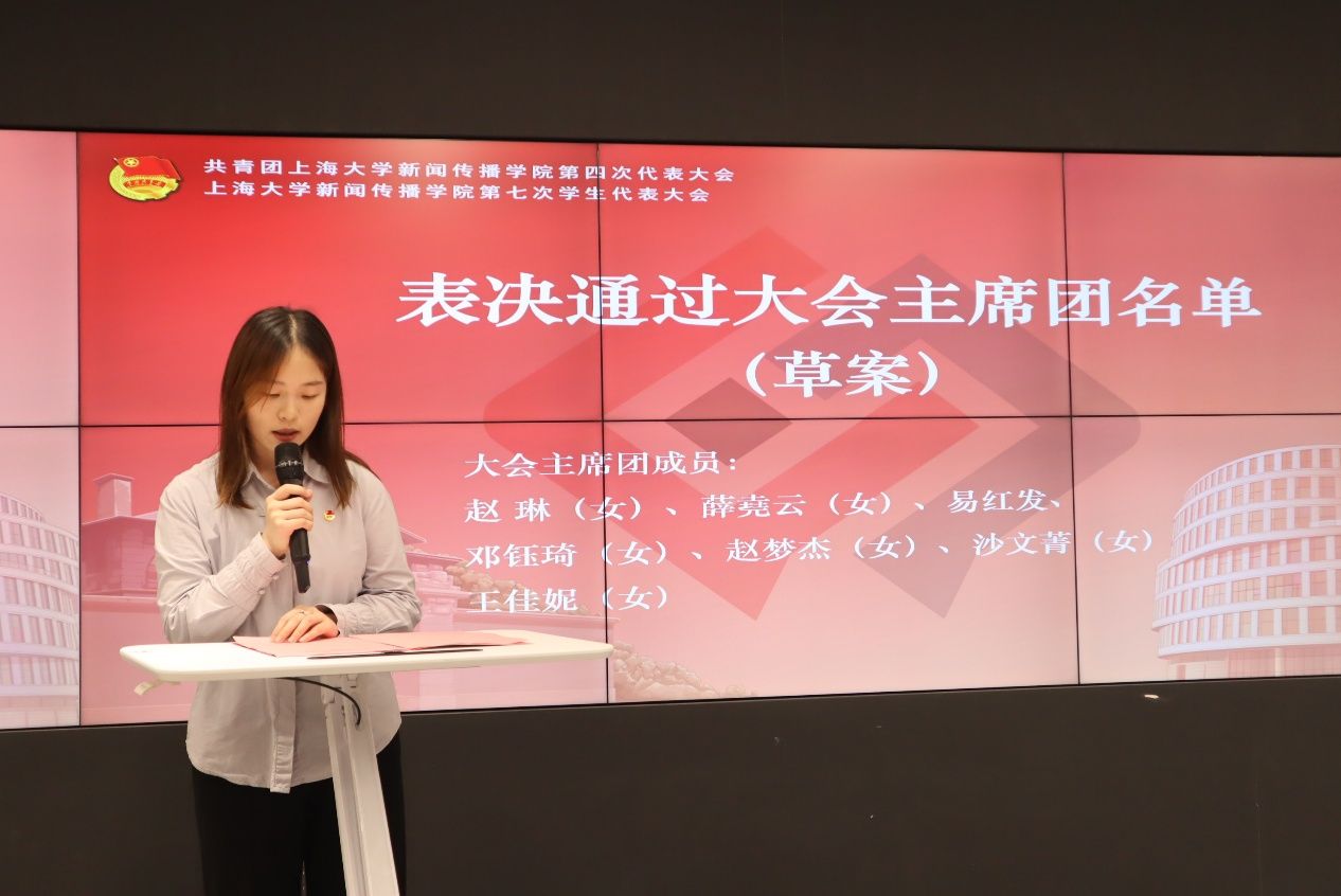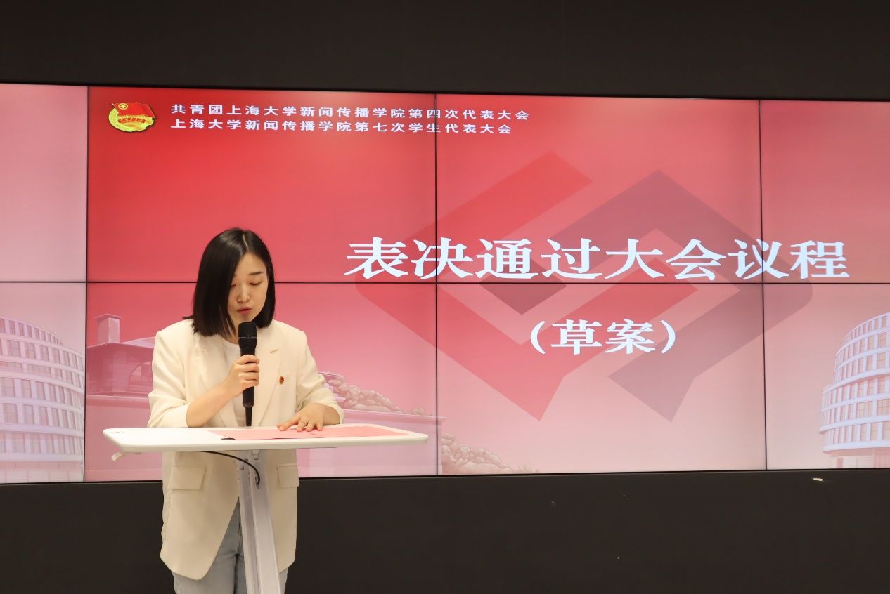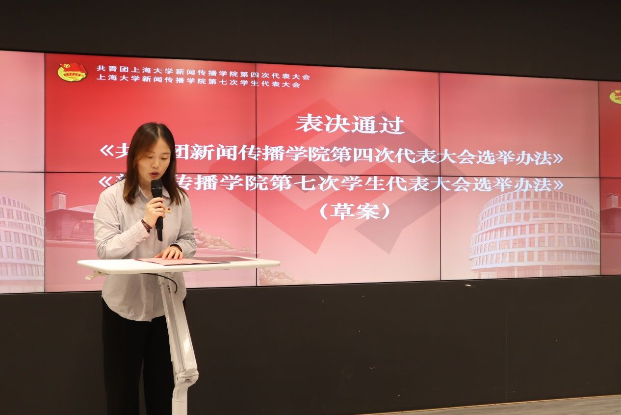 会上,双代会筹备委员会委员赵琳、薛堯云分别宣读了《beat365英国官网网站新闻传播学院关于基层团组织向党组织推荐优秀团员的实施办法》《共青团beat365英国官网网站新闻传播学院第四次代表大会选举办法》《beat365英国官网网站新闻传播学院第七次学生代表大会选举办法》,与会代表与其进行了审议与表决。