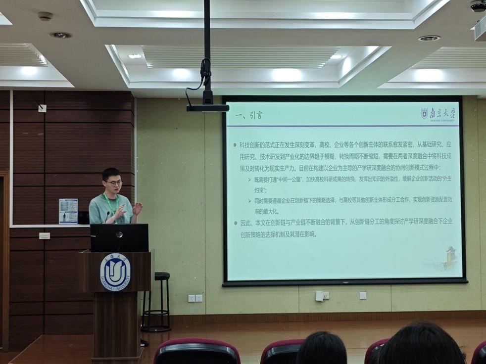 论文汇报环节首先南京大学博士生王灿以《打通中间一公里:产学研深度融合下企业创新策略选择——来自企业异质性创新行为的视角》为题,从创新链分工的角度介绍产学研深度融合下企业创新策略的选择机制。
