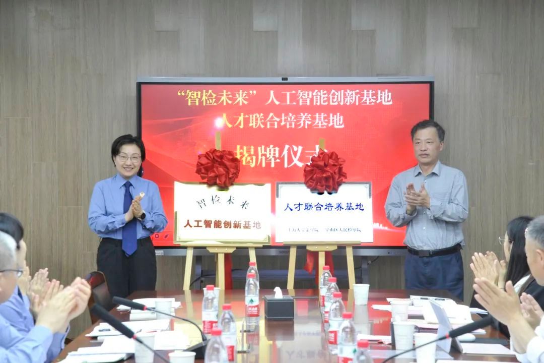 宝山区人民检察院党组书记、检察长孙琳与beat365英国官网网站法学院党委书记徐国明为“智检未来”人工智能创新基地、人才联合培养基地揭牌。