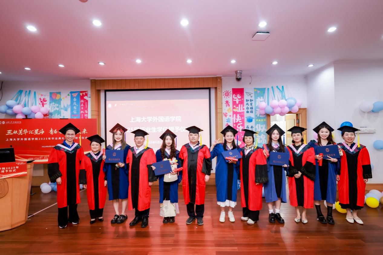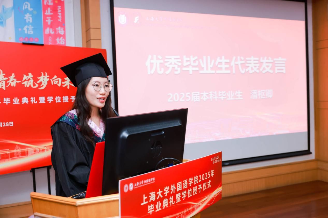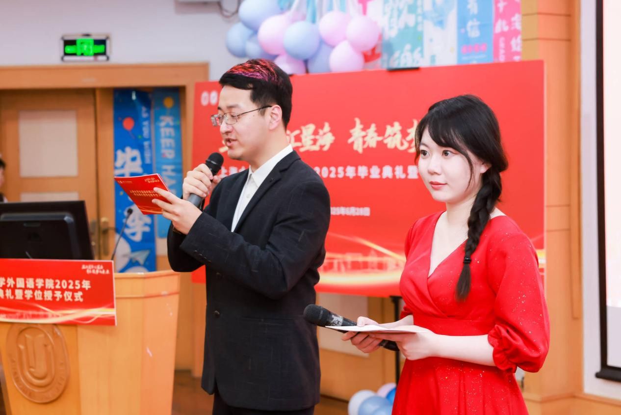6月28日下午,beat365英国官网网站外国语学院2025年毕业典礼暨学位授予仪式在宝山校区J103隆重举行。外国语学院党委书记吴蔚,党委副书记、院长尚新,党委副书记、副院长贾小琴,副院长戴朝晖、唐青叶、张建琴,英语系主任马拯,日语系主任赵莹波,副主任苏鹰、文雪,法语系主任王文新,大学生公共外语部副主任于梅欣,研究生公共外语部主任赵炯蔚,MTI中心副主任花亮,竹旭峰、张永娇、李月明、赵倩等教师代表,校友代表钟文和百余名学生家长与2025届全体毕业生共同见证了这一重要时刻。整个会场座无虚席,毕业生及家长们举起手机捕捉着幸福瞬间,脸上洋溢着骄傲、欣慰和灿烂的笑容。典礼由2021级英语专业本科生徐菁怡和2024级英语笔译专业研究生李峥赫主持。