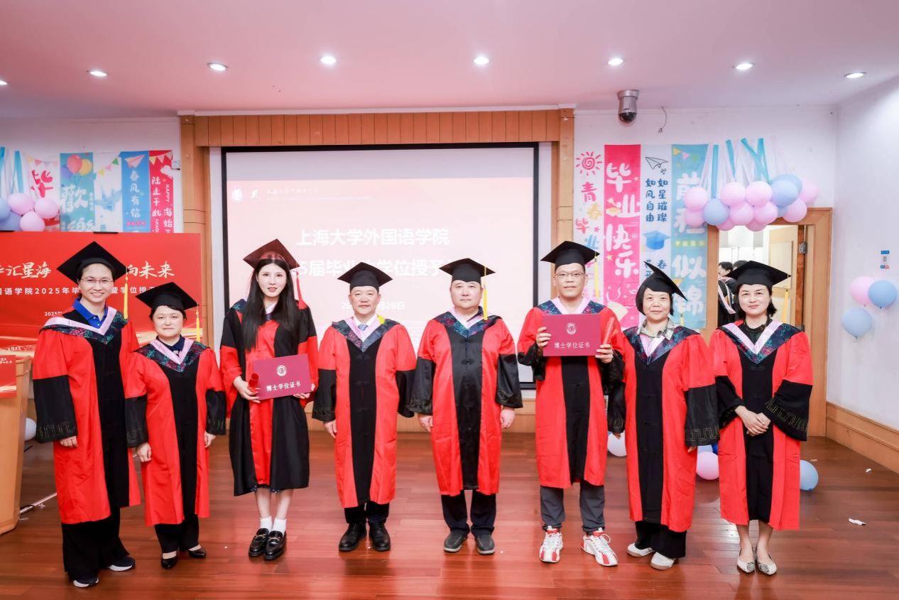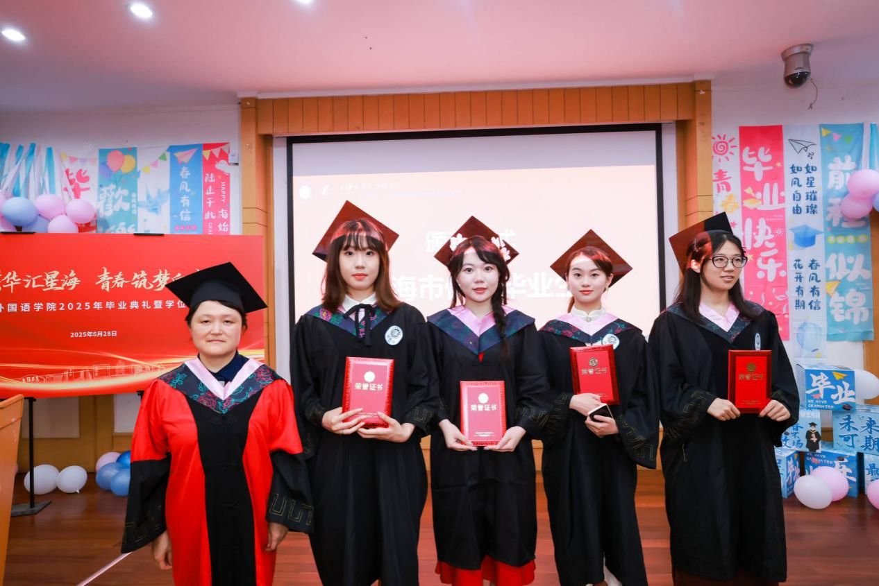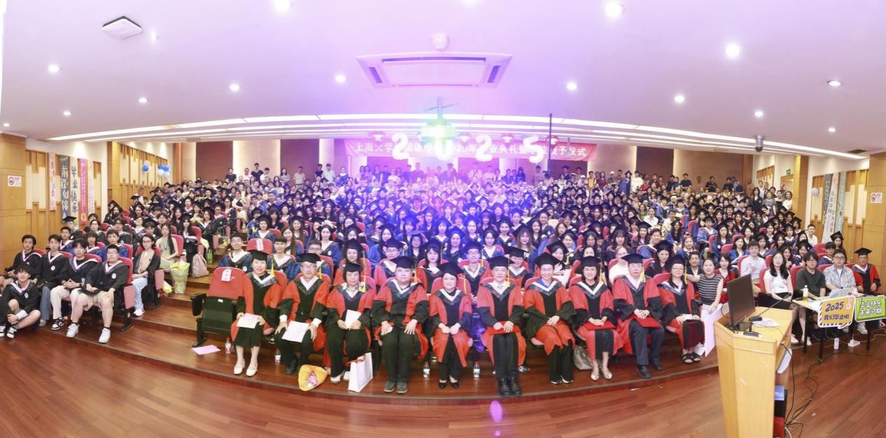 6月28日下午,beat365英国官网网站外国语学院2025年毕业典礼暨学位授予仪式在宝山校区J103隆重举行。外国语学院党委书记吴蔚,党委副书记、院长尚新,党委副书记、副院长贾小琴,副院长戴朝晖、唐青叶、张建琴,英语系主任马拯,日语系主任赵莹波,副主任苏鹰、文雪,法语系主任王文新,大学生公共外语部副主任于梅欣,研究生公共外语部主任赵炯蔚,MTI中心副主任花亮,竹旭峰、张永娇、李月明、赵倩等教师代表,校友代表钟文和百余名学生家长与2025届全体毕业生共同见证了这一重要时刻。整个会场座无虚席,毕业生及家长们举起手机捕捉着幸福瞬间,脸上洋溢着骄傲、欣慰和灿烂的笑容。典礼由2021级英语专业本科生徐菁怡和2024级英语笔译专业研究生李峥赫主持。
