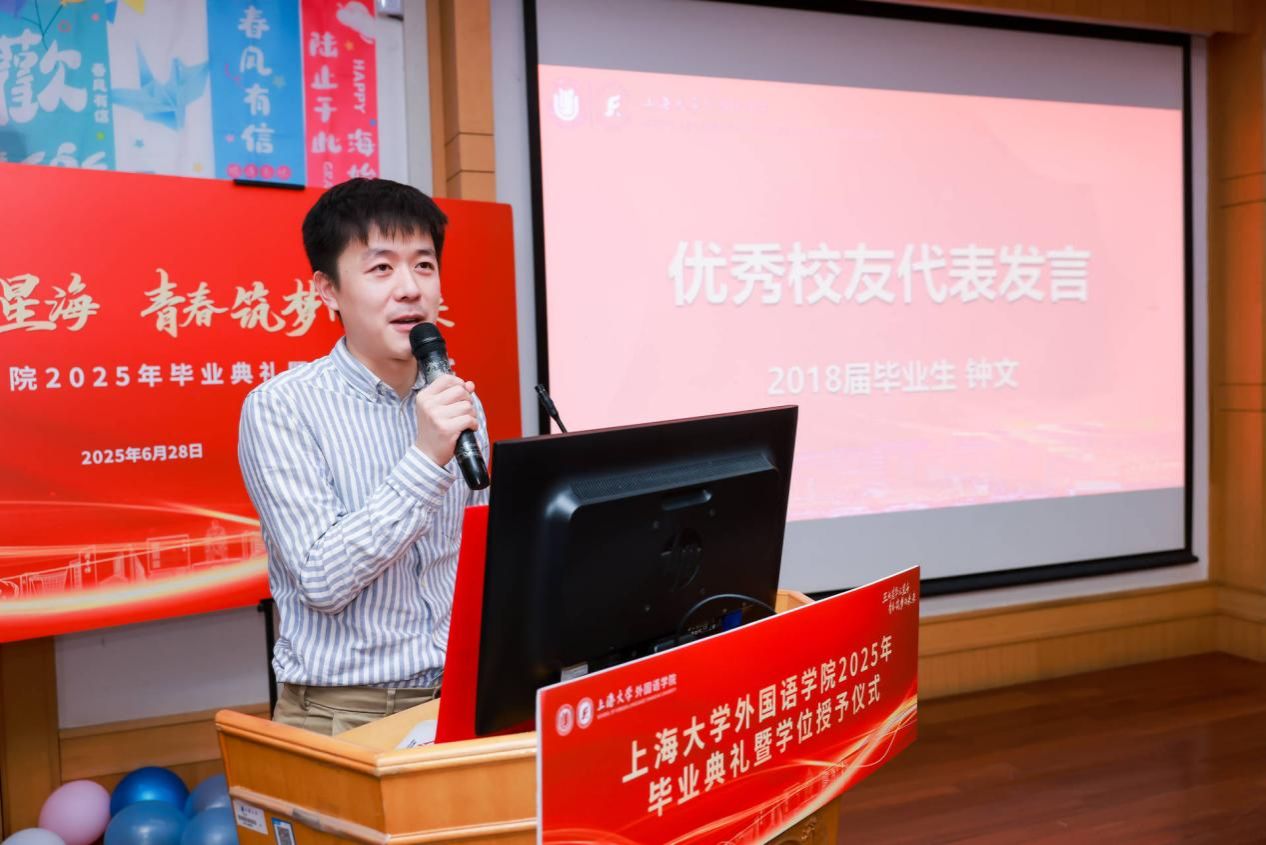 学院2018届校友钟文作为优秀校友代表登台发言,他结合自己在金融领域从事翻译工作的经历,勉励毕业生们带着外院赋予的成长馈赠——对差异的敏感、对融合的执着、对表达的敬畏,在数字文明浪潮中激活语言魅力,于时代洪流中以语言为舟楫驶向世界舞台,让跨文化沟通的智慧在全球语境中绽放独特光彩。