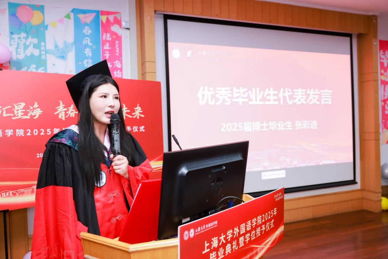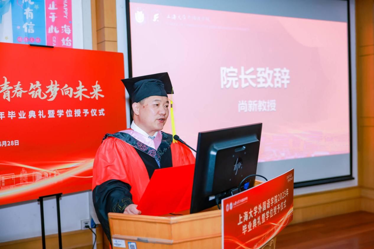 随后,外国语学院院长尚新教授致辞,他代表学院全体师生向圆满完成学业的毕业生表达了热烈祝贺,希望毕业生们做思辨求真的捍卫者、初心如磐的追光者、创新致远的开拓者、心怀温度的奋斗者,未来无论面对何种挑战,保持对他人的同理心、对社会的责任感,同时擅用智能技术,充分发挥外语专业优势,让世界听见中国青年的时代强音,也让世界见证大家融汇中外的精彩人生。