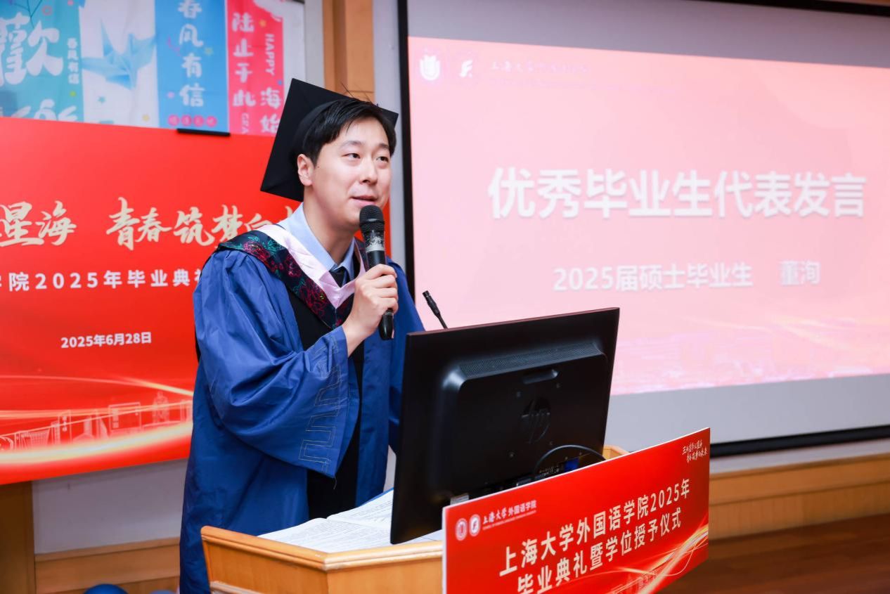 董洵同学分享了《在希望中完结的物语》,感恩学院搭建的广阔平台,让大家领略文学的斑斓画卷,感悟文学研究的无尽奥蕴。他以研究生三年勤学不辍的坚守,勾勒出专属的上大物语,成功斩获复旦大学外文学院博士深造资格。临别之际,他勉励学弟学妹们以勤为楫,奋楫逐浪于学术之海,在求知路上续写属于自己的理想华章。