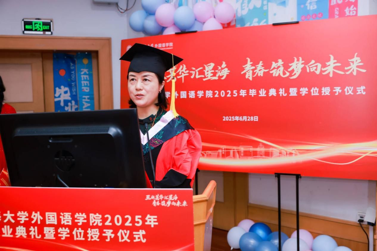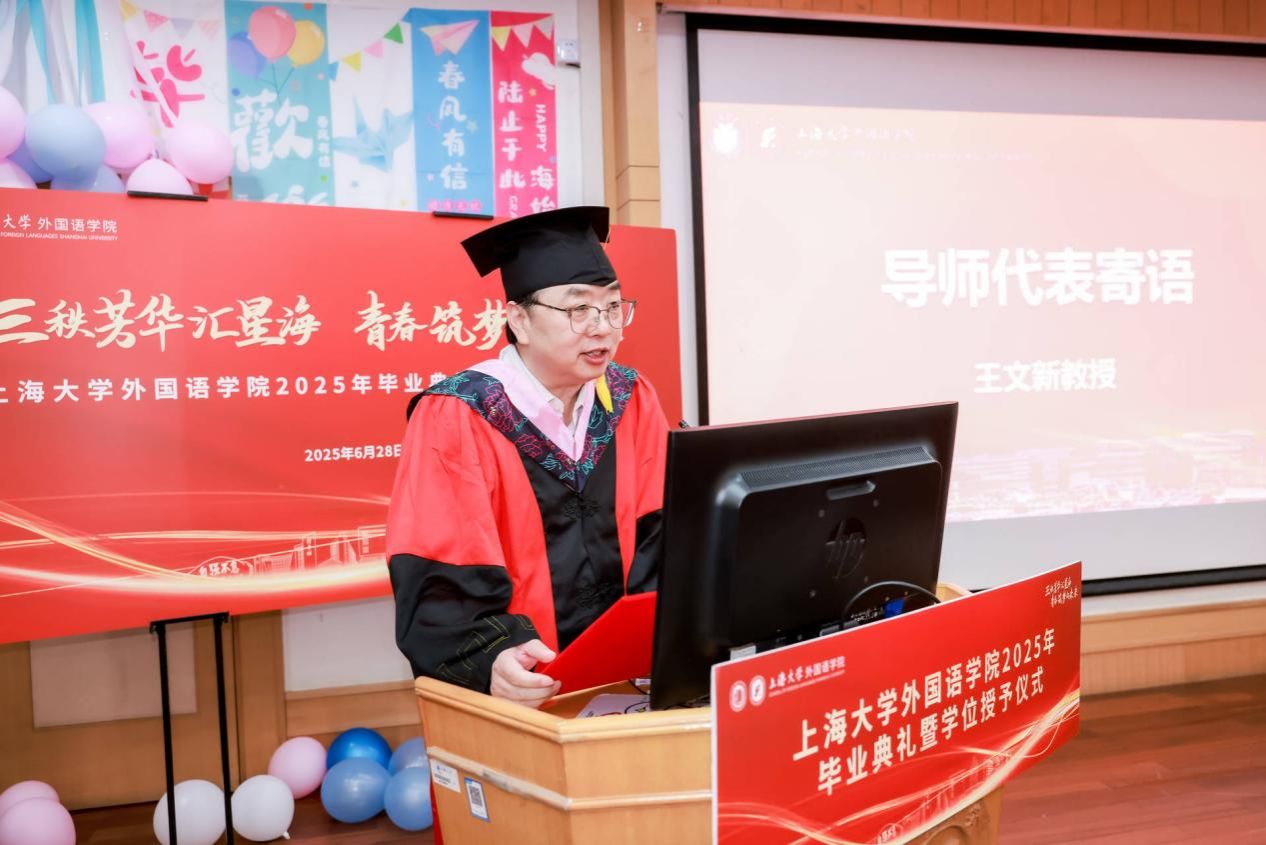导师们的谆谆教诲点燃了学生们探求新知的火苗。在这个特别的时刻,导师代表法语系主任王文新教授向毕业生们寄语,勉励大家深耕外语学习的征程中,既要坚守语言研习的本源,更需以创新为翼开拓发展新境。唯有不断丰盈外语的文化内涵,方能在中外文明交流互鉴的时代浪潮中勇担桥梁之责。