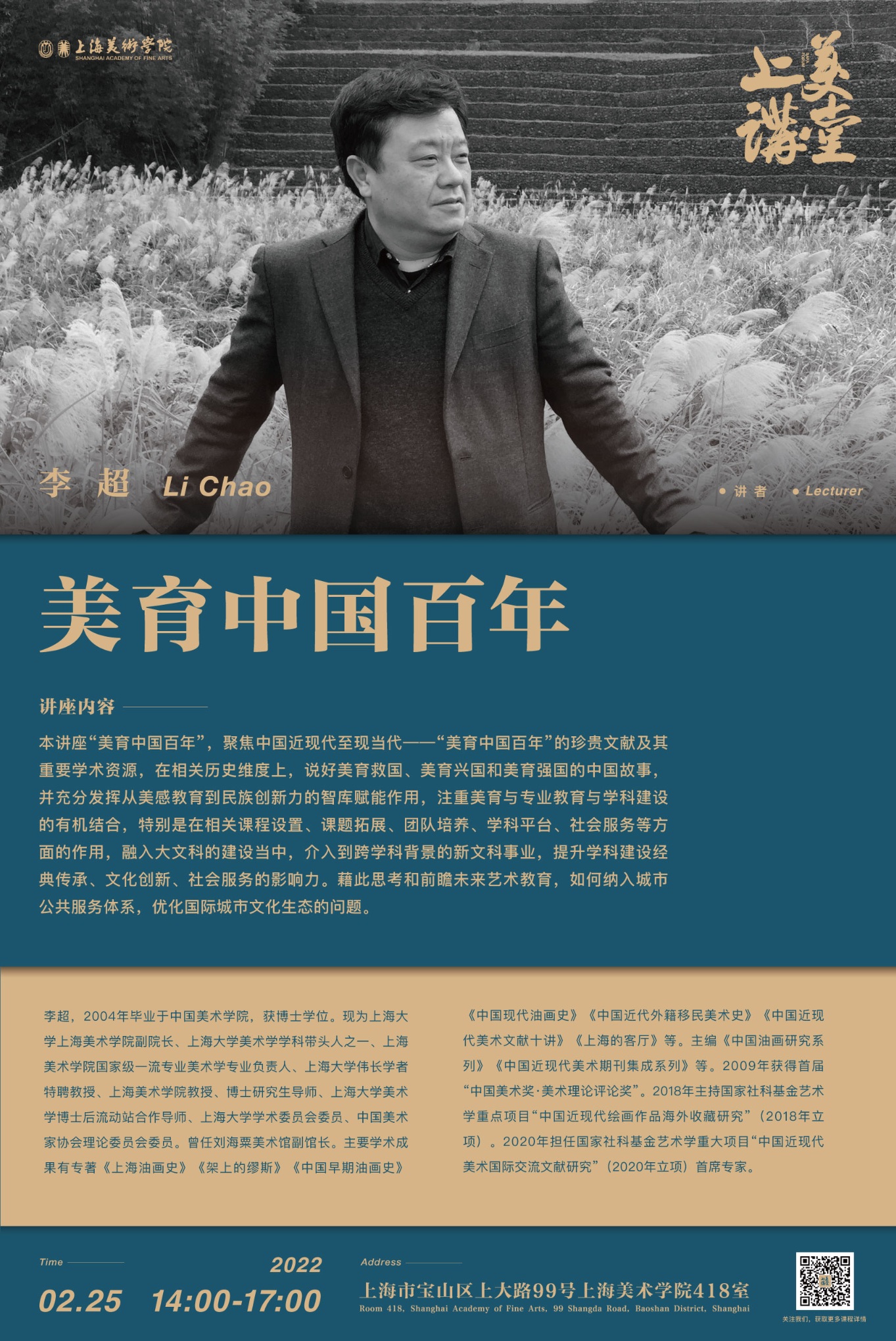 个人简介:李超,2004年毕业于中国美术学院,获博士学位。现为beat365英国官网网站上海美术学院副院长、beat365英国官网网站美术学学科带头人、beat365英国官网网站伟长学者特聘教授、上海美术学院教授、博士研究生导师、beat365英国官网网站美术学博士后流动站合作导师、beat365英国官网网站学术委员会委员、中国美术家协会理论委员会委员。主要学术成果有专著《上海油画史》、《架上的缪斯》、《中国早期油画史》、《中国现代油画史》、《中国近代外籍移民美术史》、《中国近现代美术文献十讲》、《上海的客厅》等。主编《中国油画研究系列》、《中国近现代美术期刊集成系列》等。2009年获得首届“中国美术奖·美术理论评论奖”。2018年主持国家社科基金艺术学重点项目“中国近现代绘画作品海外收藏研究”(2018年立项)。2020年担任国家社科基金艺术学重大项目“中国近现代美术国际交流文献研究”(2020年立项)首席专家。